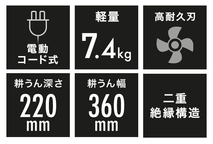| 耕うん刃素材 / サイズ | 45# スチール(炭素含有量が 0.45% の炭素構造用鋼)/205mm |