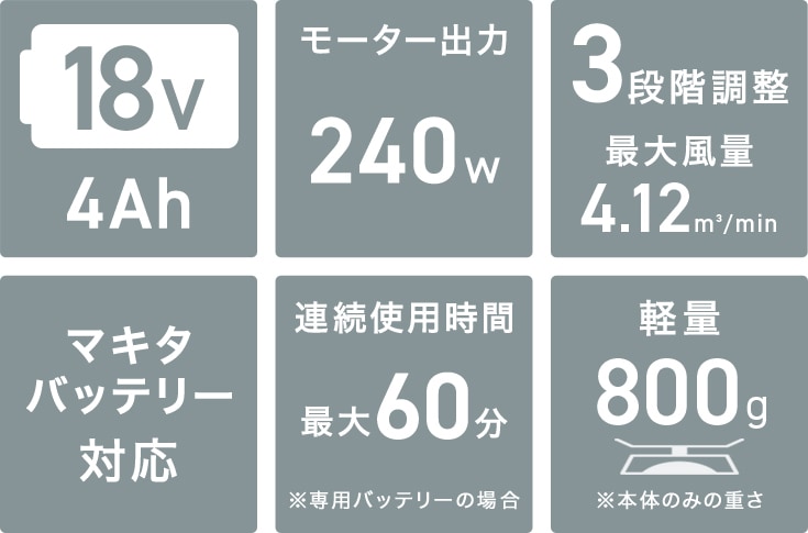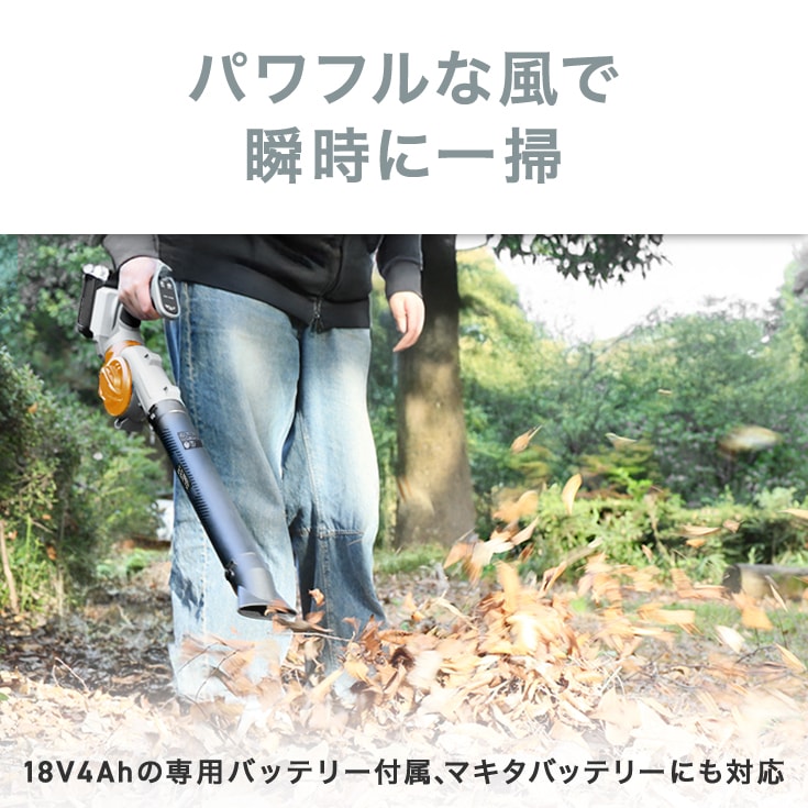 | 付属品 | 本体 延長チューブ1本 丸型ノズル(タイプA)1個 大型丸型ノズル(タイプB)1個 角度付きノズル(タイプC)1個 アクセサリノズル1個 ※バッテリー付きは以下も付属 専用バッテリー(18V 4Ah)1個 充電器1個 |